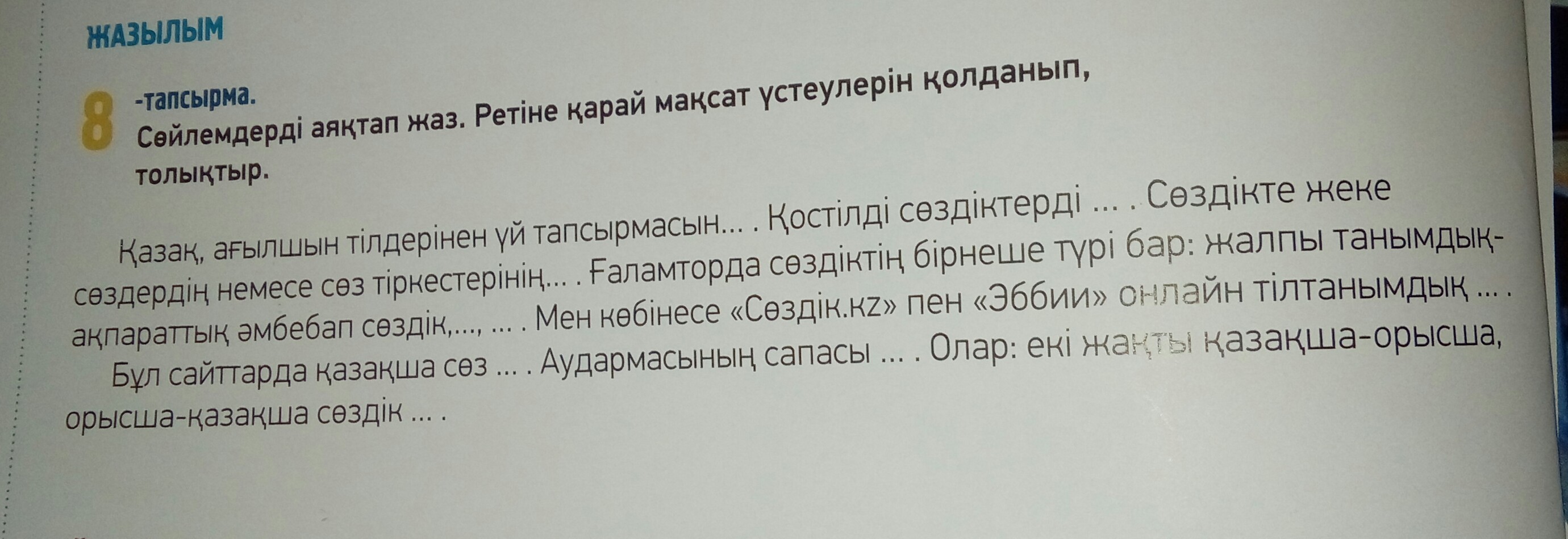 Қазақ, ағылшын тілдерінен үй тапсырмасын орындаған кезде міндетті түрде ғаламторды пайдаланамын. Қостілді сөздіктерді пайдаланамын. Сөздікте жеке сөздердің немесе сөз тіркестерінің аудармасы болады. Ғаламторды сөздіктің бірнеше түрі бар: жалпытанымдық - ақпараттық, әмбебап сөздік, аударма, түсіндірме сөздік. Мен көбінесе "sozdik.kz" және "Эббии" онлайн тілтанымдық сайттарын пайдаланамын. Бұл сайттарда қазақша сөз көп. Аудармасының сапасы жақсы. Олар екі жақты қазақша - орысша, орысша - қазақша сөздік түрінде жабдықталған.
