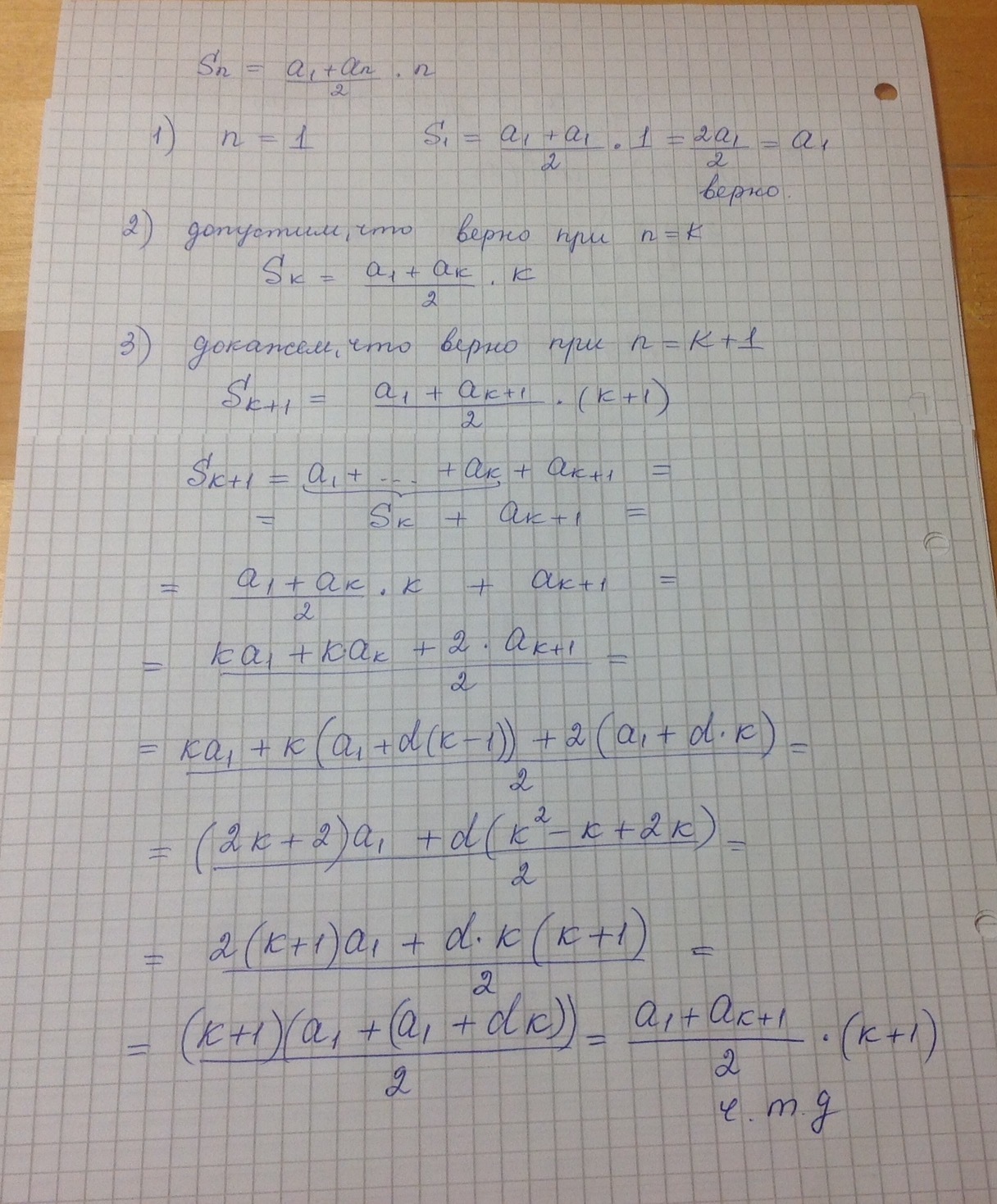 докажите справедливость формулы методом математической индукции Sn=(a1+an)×n/2 (формула суммы первых n членов арифметической прогрессии)