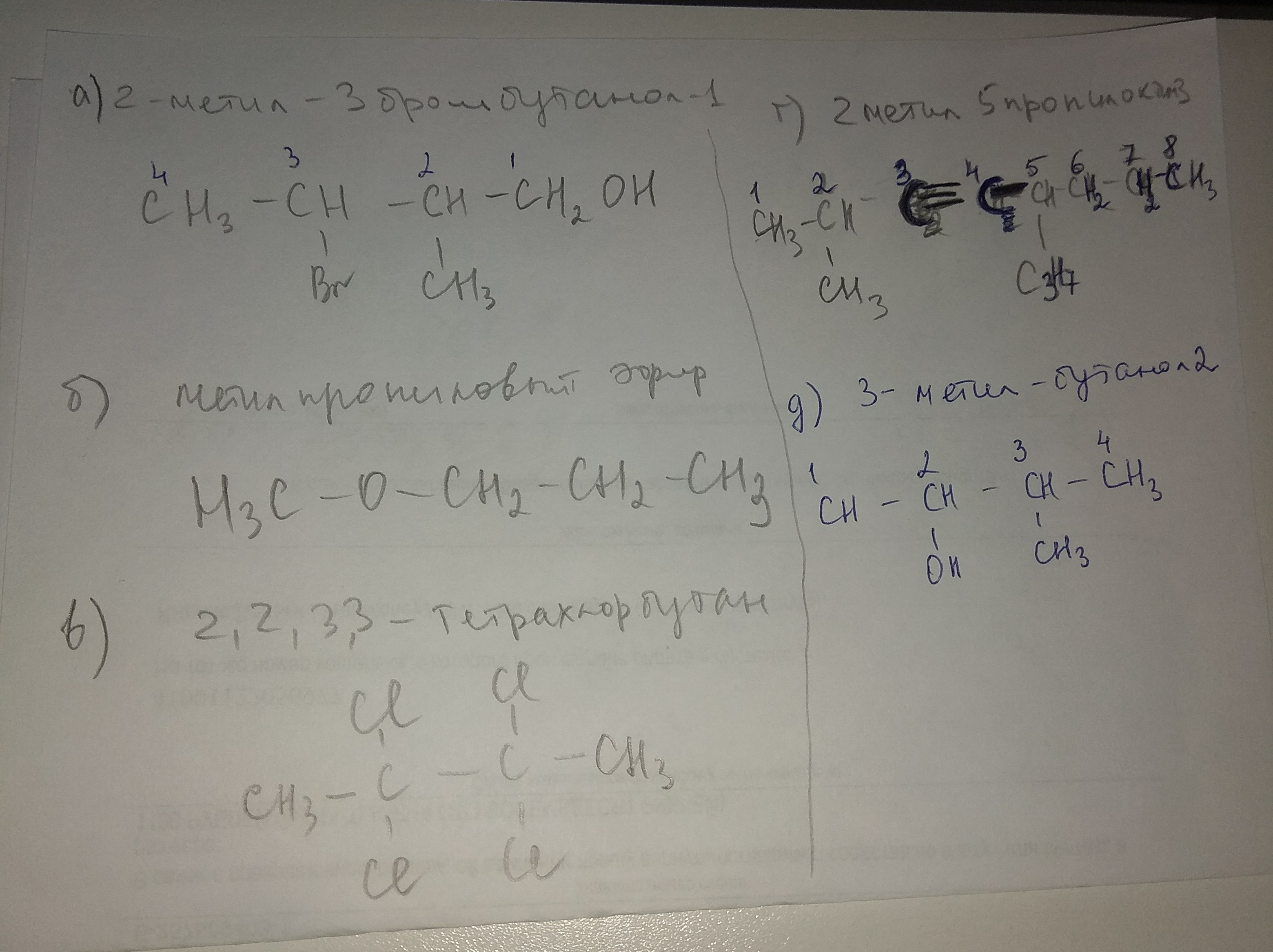Напишите структурные формулы след. соединений: а)2-метил-3-бромбутанол-1 б)метилпропиловый эфир в)2,2,3,3-тетрохлорбутан г)2-метил-5-пропилоктин-3 д)3-метилбутанол-2