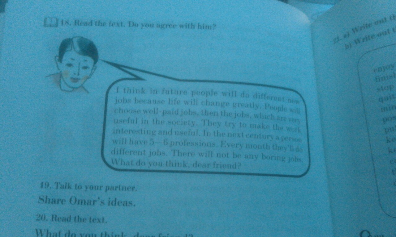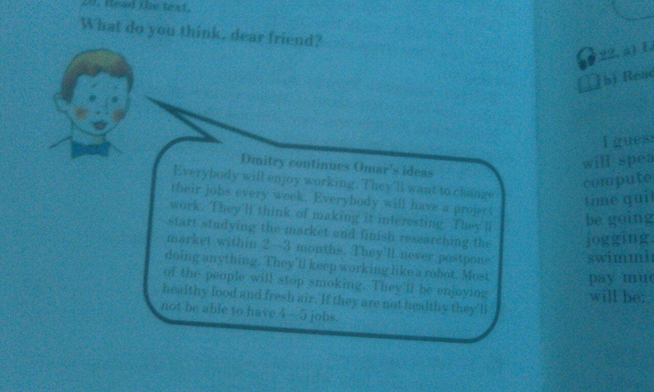 1. Я думаю, в будующем люди будут выполнять различные новые работы, так как жизнь сильно изменится. Люди будут предпочитать общественнополезную работу, хорошо оплачиваемовой. Они будут стараться делать работу интересной и полезной. В следующем веке у человека будет по 5 - 6 профессий. Каждый месяц они будут делать различную работу. Не будет ни одной скучной работы. Что ты думаешь по этому поводу, дорогой друг?