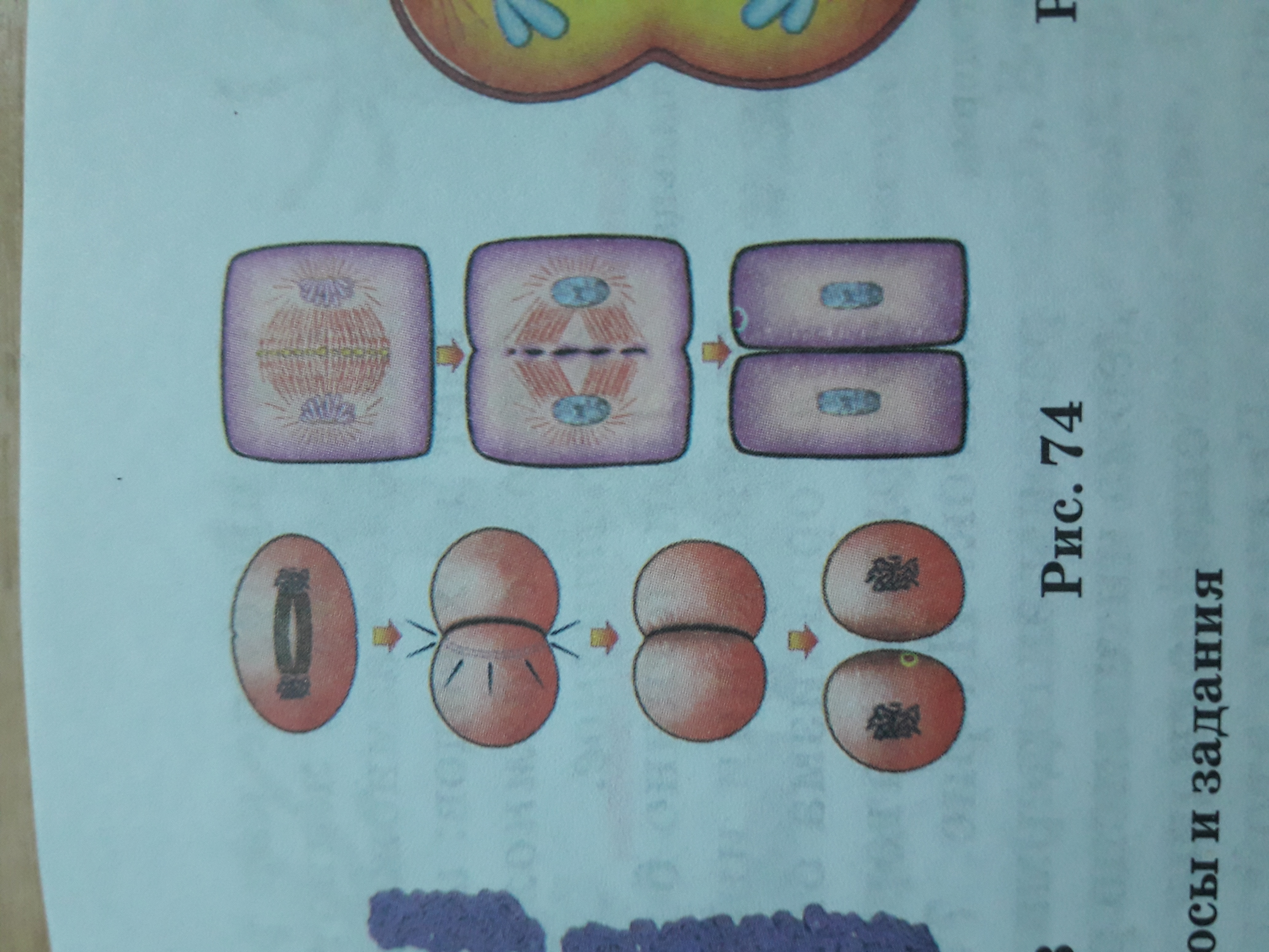 Клетки каких организмов даны на рис.74 ? Какие фазы изображены? Дайте объяснение изображенных процессов