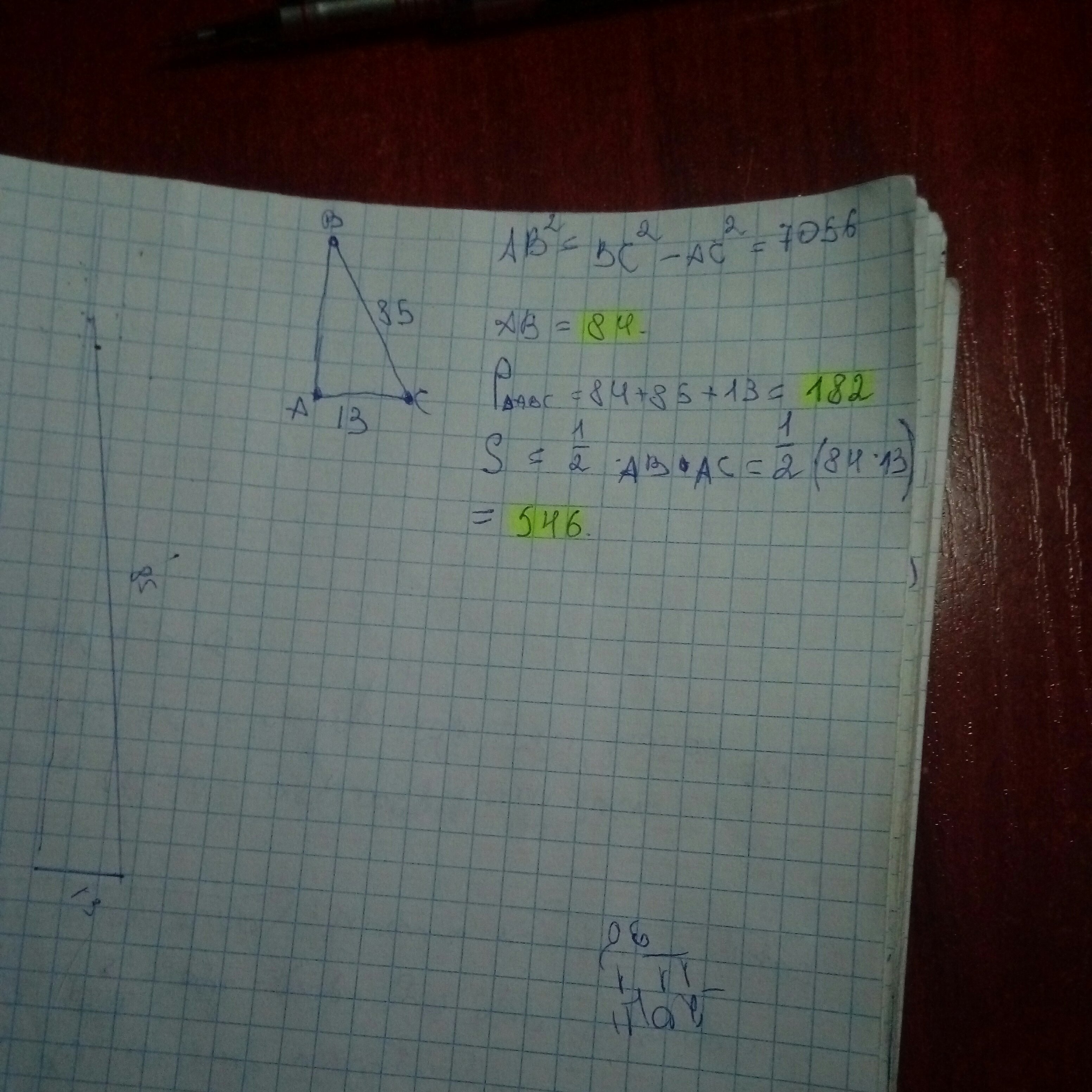 площадь - 1/2( АВ × АС) = 1/2 (84×13) = 546