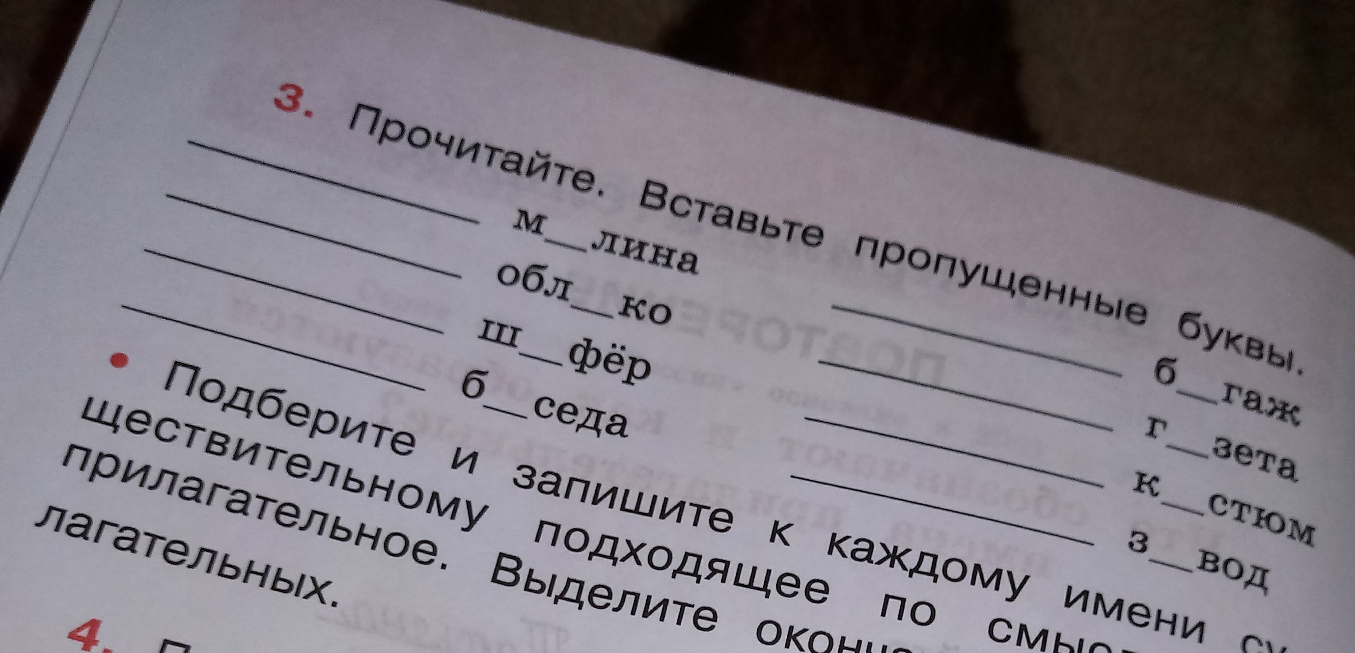 Прочитайте вставьте пропущенные пропущенные буквы подбери подберите и запишите к каждому имени существительному подходящее по смыслу имя прилагательное Выдели окончания имен прилагательных малина в акушах Победа багаж газета костюмы завод