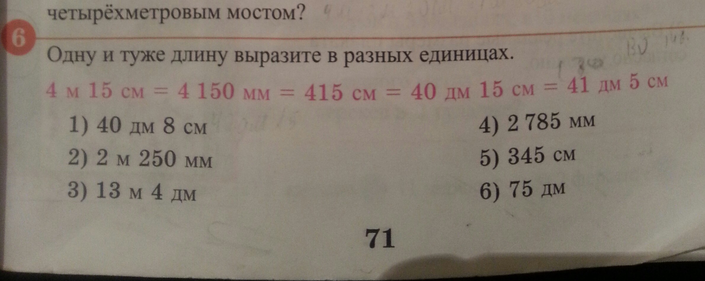 4)) 2785 мм= 278см 5мм = 27дм 8см 5мм = 2м 7 дм 8 см 5мм