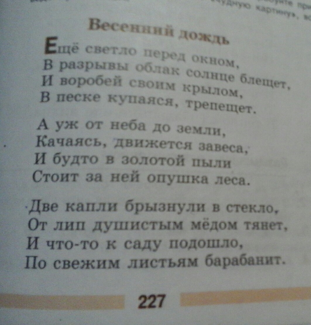 1-2. Стихотворение "Весенний дождь" изображает начало весеннего ливня и звучит отрадно, светло, мажорно. Это настроение передается м отзывчивому читателю.