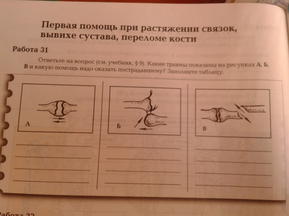 биология. 8 класс. Первая помощь при растяжении связок, вывихе сустава, переломе кости. параграф 9