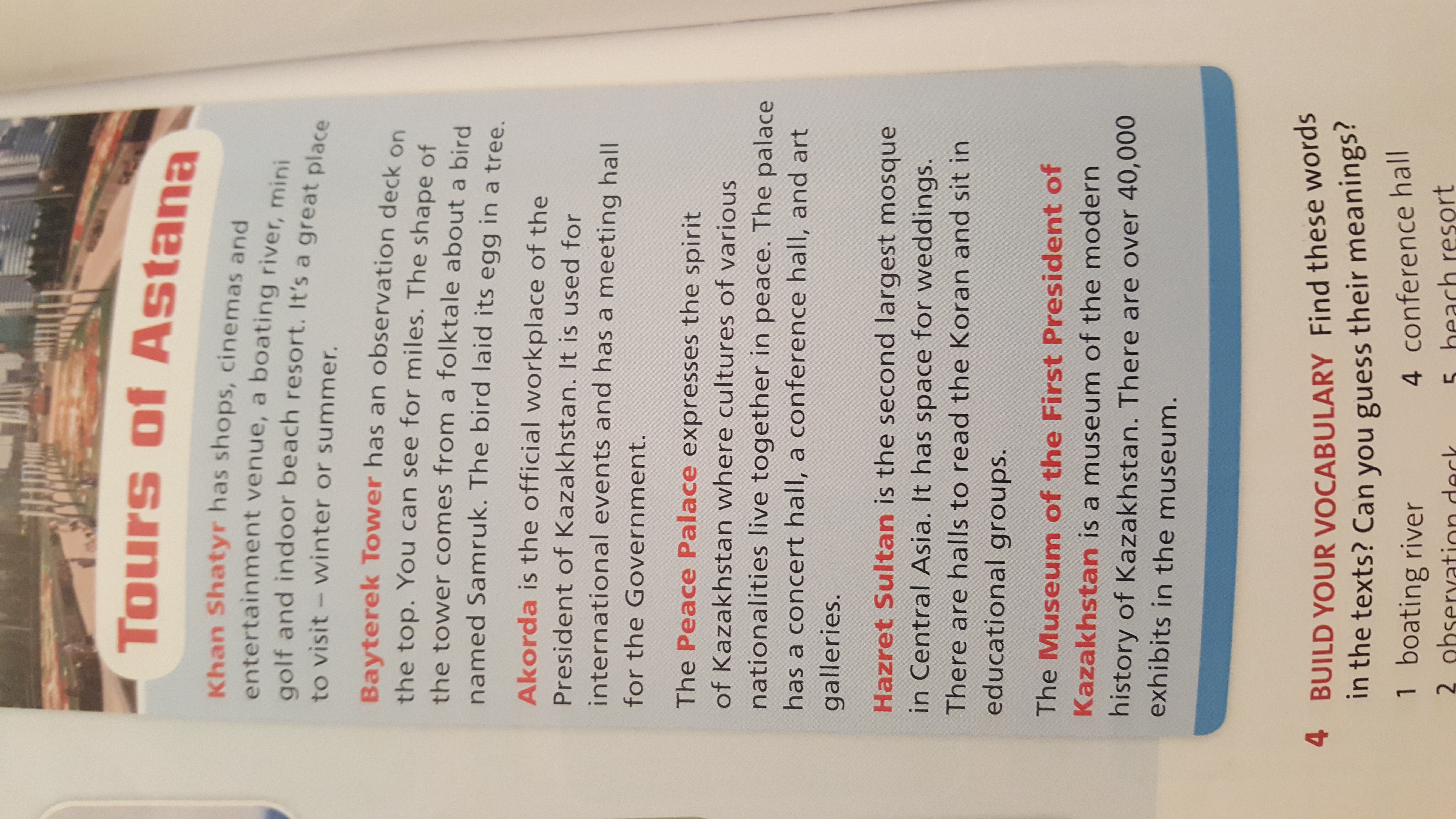 Хан Шатыр имеет магазины, кинотеатры и развлекательные заведения, катание на лодках , мини-гольф и закрытый пляжный курорт. Это отличное место для посещения зимой или летом. Башня Байтерек имеет смотровую площадку на вершине. Вы можете видеть все за мили. Форма башни исходит из сказки о птице по имени Самрук. Птица положила свое яйцо в дерево. Акорда-официальное рабочее место Президента Казахстана. Он используется для международных мероприятий и имеет конференц-зал для правительства. Дворец мира выражает дух Казахстана, где в мире живут культуры разных национальностей. Во дворце есть концертный зал, конференц-зал, художественные галереи. Хазрет Султан-вторая по величине мечеть в Центральной Азии. Здесь есть место для свадеб. Есть залы для чтения Корана и сидения в учебных группах. Музей Первого Президента Республики Казахстан-это музей новейшей истории Казахстана. В музее более 40000 экспонатов.