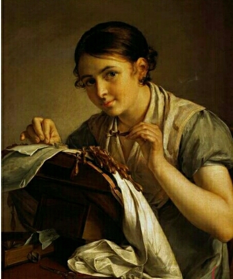 На этой картине изображена молодая девушка за кропотливой работой. Она плетет кружево, но при этом смотрит на нас. Ее взгляд робкий, стеснительный,аккуратный и добрый. Она как будто улыбается глазами, проявляя к наблюдателю вежливое внимание. На губах у неё тоже играет улыбка, на щеках образуются ямочки. Кожа у неё чуть-чуть загорелая, ровная, а платье с коротким рукавом, значит, на дворе лето или весна. Волосы у нее заведены за ухо, чтобы не мешались, но непокорные кудри кое-где выбиваются из прически. Движения аккуратны и точны, видно, как бережно она держит нитку, как аккуратно работает. Платье на ней не новое, но содержится в порядке. Наверное, она надевала его только в исключительных случаях.