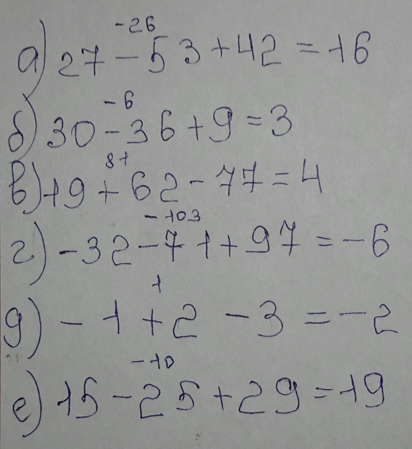 Вычислите пожалуйста: а) 27 - 53 + 42 = б) 30 - 36 + 9 = в) 19 + 62 - 77 = г) -32 - 71 + 97 = д) -1 + 2 - 3 = е) 15 - 25 +29 =
