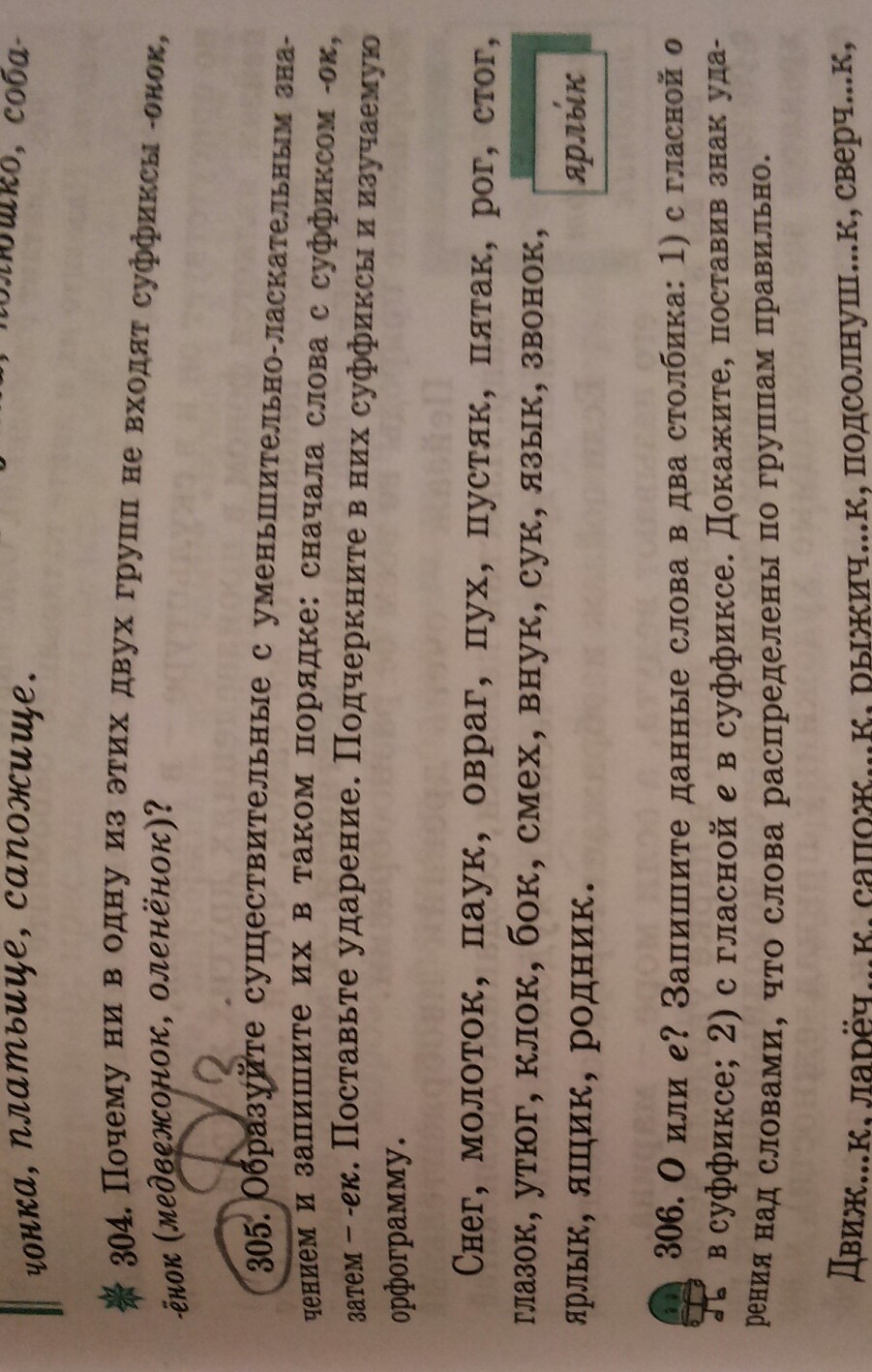 Снежочек,молоточек,паучек,пушочек,пустячок,пятачок,рожог,стог(?),гглазочек,утюжок,клочочек,бочок,смешочек,внучечек,сучечек,язычок,звоночек,ярлычок,ящичек,родничок