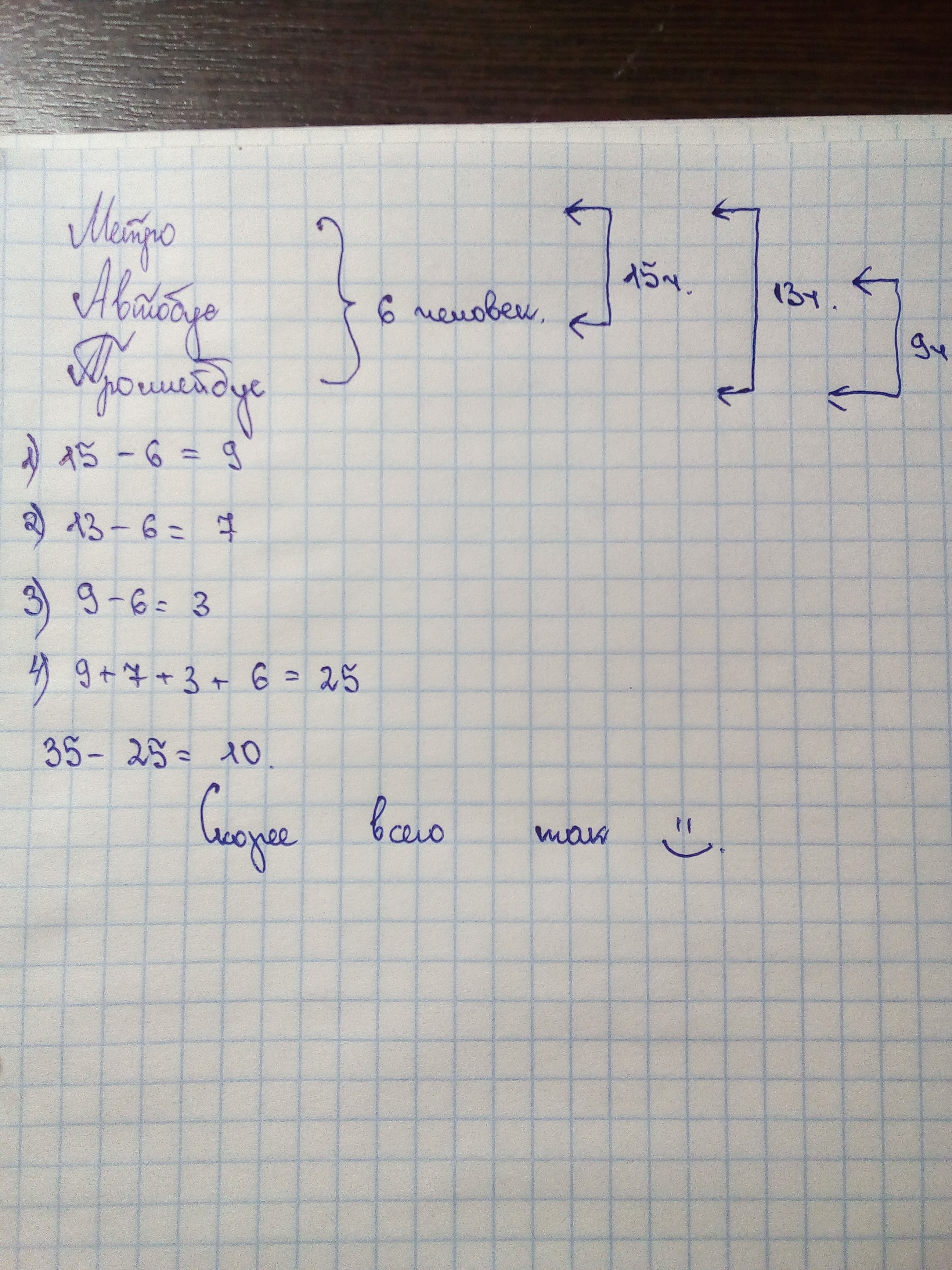 В спртивной секции 35 учеников,каждый из них пользуется хотябы одним видом транспорта: метро,автобус, троллейбус. Всеми тремя видами пользуются 6человек,метро и автобусом пользуется 15 человек,метро и троллейбусом 13человек,троллейбусом и автобусом 9 человек. Сколько человек пользуются