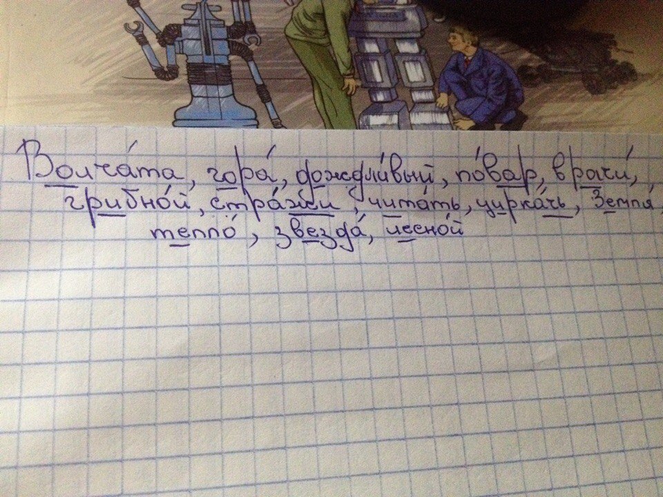 Нужно поставить ударение и подчеркнут орфограмму: Волчата. Гора. Дождливый. Повар. Врачи. Грибной. Стражи. Читать. Циркачь. Земля. Тепло. Звезда. Лесной.