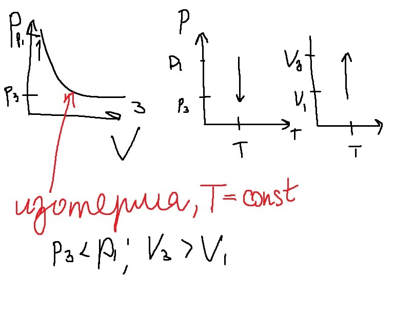 На рисунке показан процесс изменения состояния идеального газа. Какими процессами газ переведен из состояния 1 в состояние 3? Представьте этот процесс в координатных осях V, T и p,T