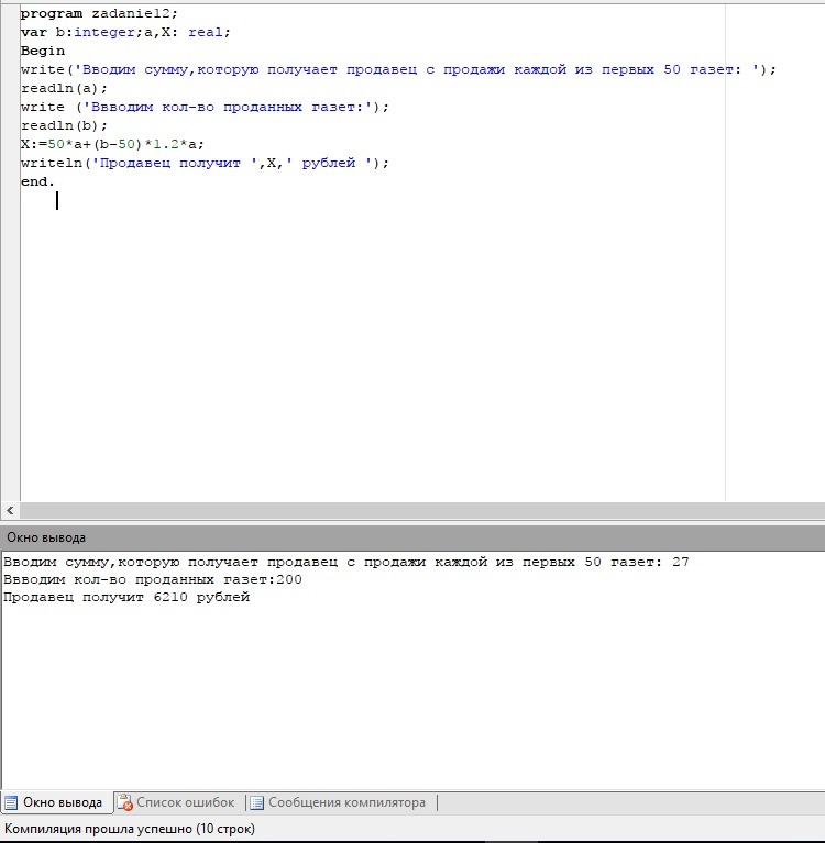 write('Вводим сумму,которую получает продавец с продажи каждой из первых 50 газет:');