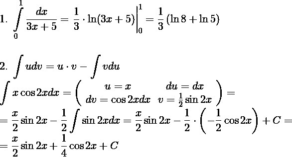 1.;intlimits_0^1frac{dx}{3x+5}=left.frac13cdotln(3x+5)right|limits_0^1=frac13left(ln8+ln5right)\\\2.;int udv=ucdot v-int vdu\int xcos2xdx=left(begin{array}{cc}u=x&du=dx\dv=cos2xdx&v=frac12sin2xend{array}right)=\=frac x2sin2x-frac12intsin2xdx=frac x2sin2x-frac12cdotleft(-frac12cos2xright)+C=\=frac x2sin2x+frac14cos2x+C