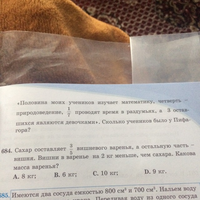 3/5-2/5 = 1/5 - на столько частей вишни меньше, чем сахара.