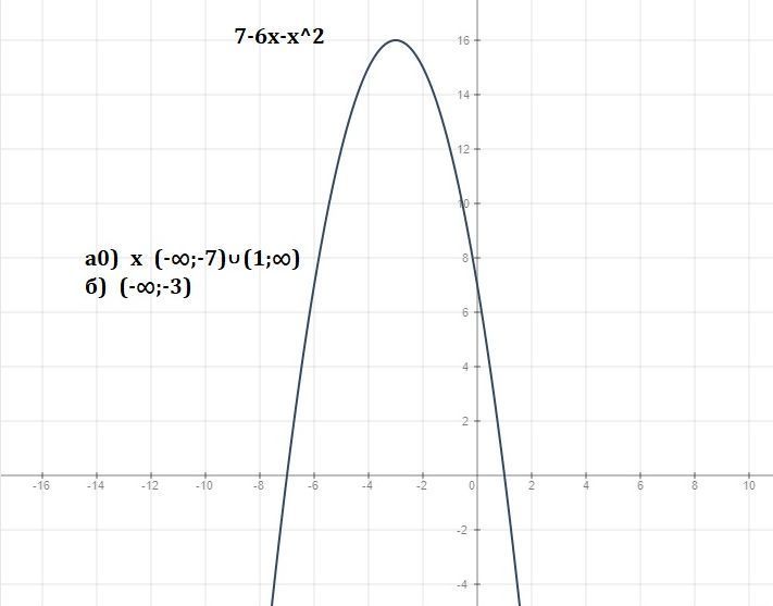 постройте график функции y=7-6x-x2.Найдите а) при каких значениях аргумента значения функции отрицательны; б) при каких значениях аргумента функция возрастает.