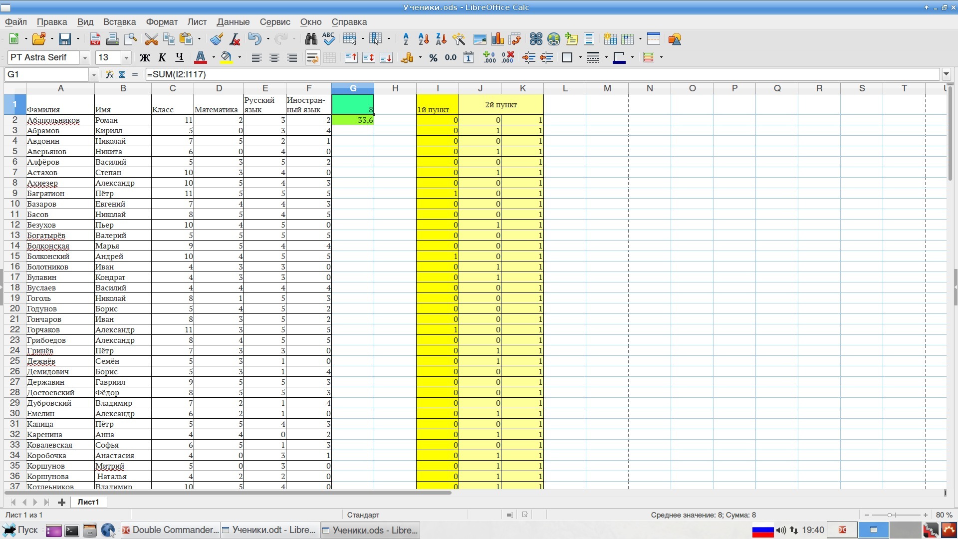 Смотрите файл таблиц Ученики.ods или Ученики.xls. Можете её достроить. А можете просто менять оценки и классы наблюдать за изменениями результатов.