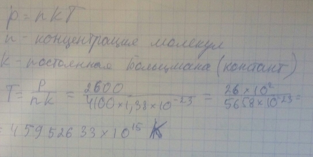 При какой температуре газ с концентрацией молекул 4∙1025 м -3 оказывает давление на стенки сосуда 25∙104 Па?