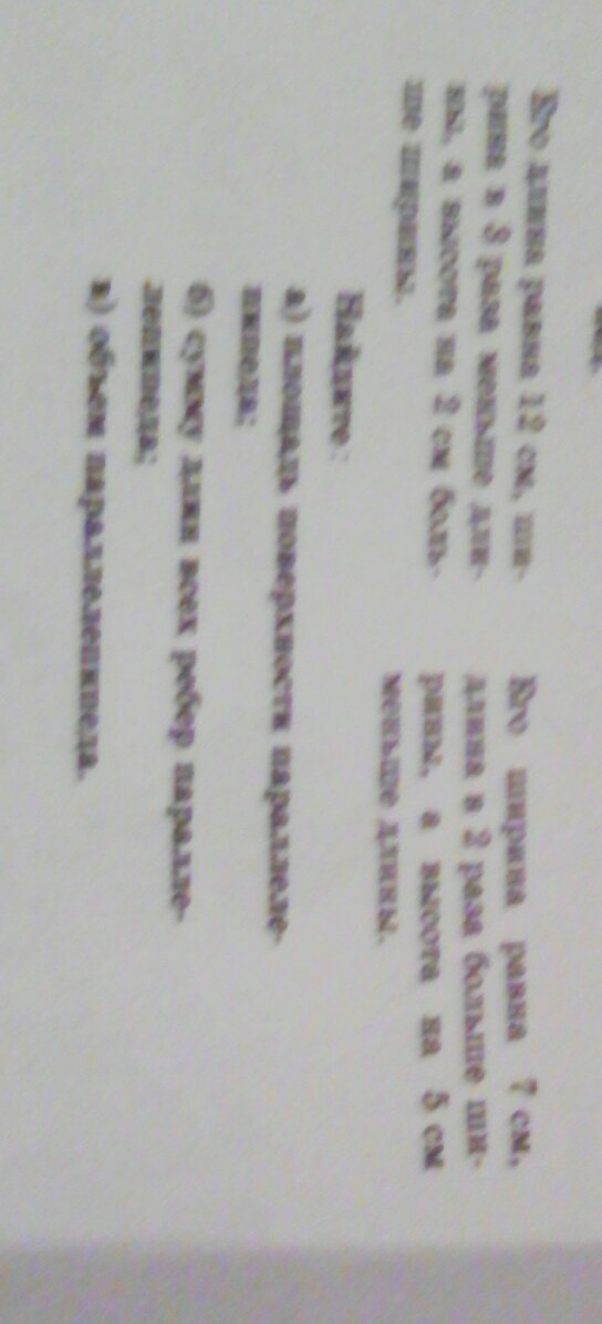 угольный параллелепипед если его длина 12 см ширина в 3 раза меньше длины А высота на 2 см больше ширины а Найди площадь поверхности параллелепипеда в сумму длин всех ребер параллелепипеда в Объем параллелепипеда
