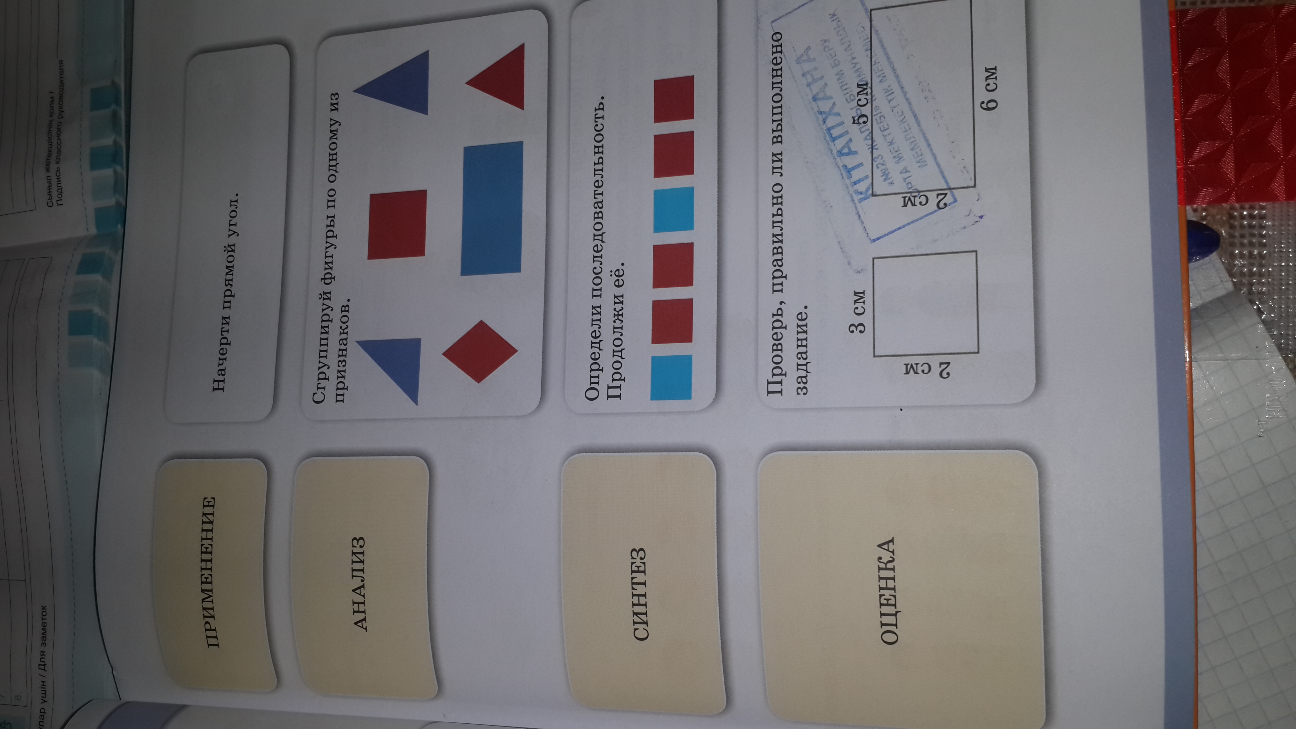 синие и красные фигуры; четырёхугольники и треугольники (на твоё усмотрение)