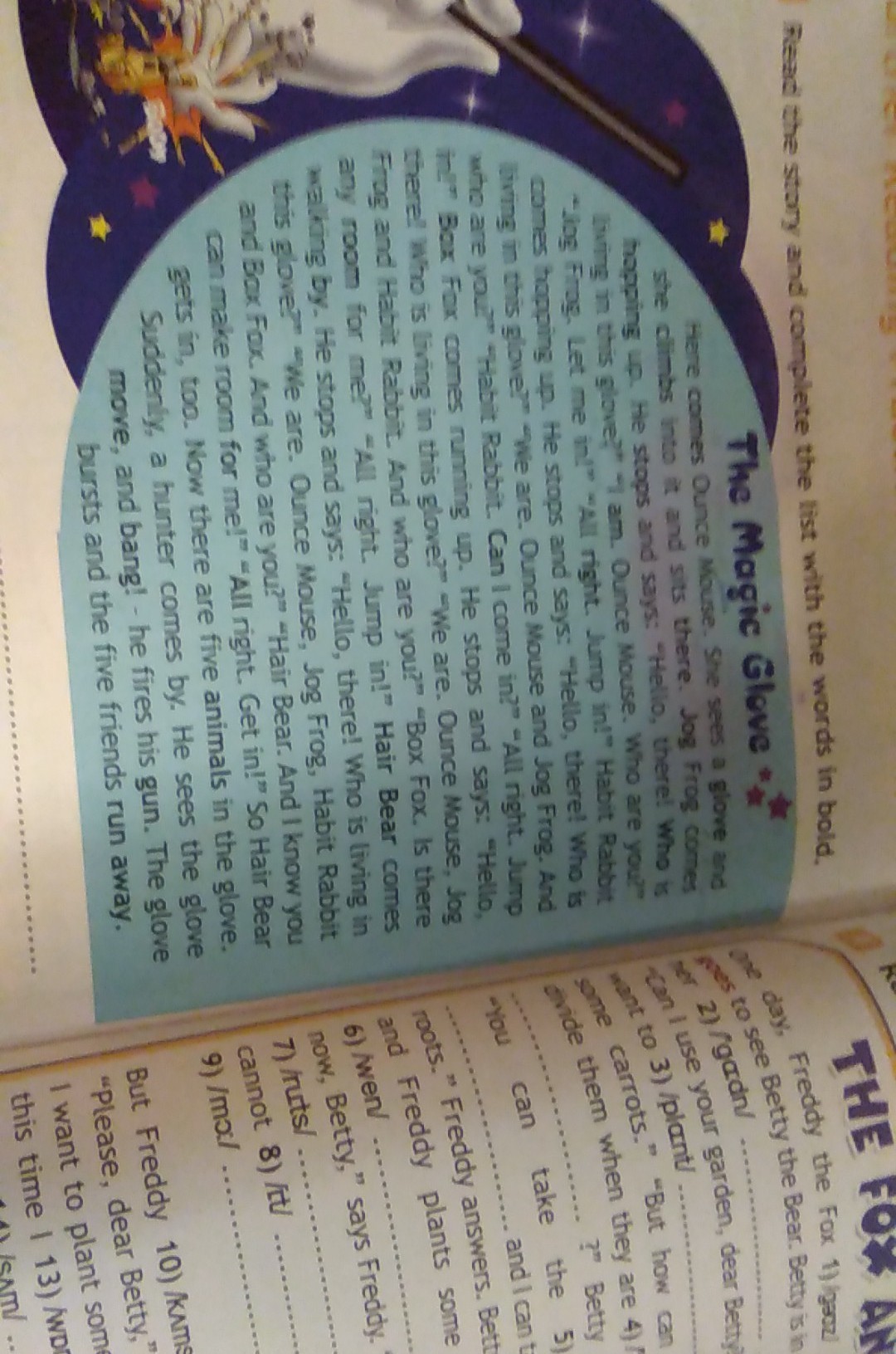 Тут приходит Ounce (унция, капля) мышь. Она видит перчатку, забирается в неё и сидит там. Jog (толчок) лягушка приходит, подпрыгивая. Он останавливается и говорит: "Привет всем! Кто живёт в этой перчатке?" "Я. Ounce мышь. Кто ты?" "Jog лягушка. Пусти меня внутрь!" "Хорошо. Запрыгивай!" Habit (привычка, повадка) заяц приходит, прыгая. Он останавливается и говорит: "Привет всем! Кто живёт в этой перчатке?" "Мы. Ounce мышь и Jog лягушка. А кто ты?" "Habit заяц. Можно ли мне войти?" "Хорошо. Запрыгивай!" Box (коробка) лиса прибегает. Он останавливается и говорит: "Всем привет! Кто живёт в этой перчатке?" "Мы Ounce мышь, Jog лягушка и Habit заяц. А ты кто?" "Box лиса. Не найдётся ли комнаты для меня?" "Хорошо. Запрыгивай!" Hair (шерсть) медведь приходит. Он останавливается и говорит: "Привет всем! Кто живёт в этой перчатке?" "Мы. Ounce мышь, Jog лягушка, Habit заяц и Box лиса. А ты кто?" "Hair медведь! И я знаю, мы сможете предоставить мне комнату!" "Хорошо. Заходи!" Так Hair медведь также забирается внутрь. Теперь там пять животных в этой перчатке. Но внезапно, появляется охотник. Он видит перчатку, двигается и стреляет! Он выстреливает из своего пистолета. Перчатка взрывается и пять животных убегают.