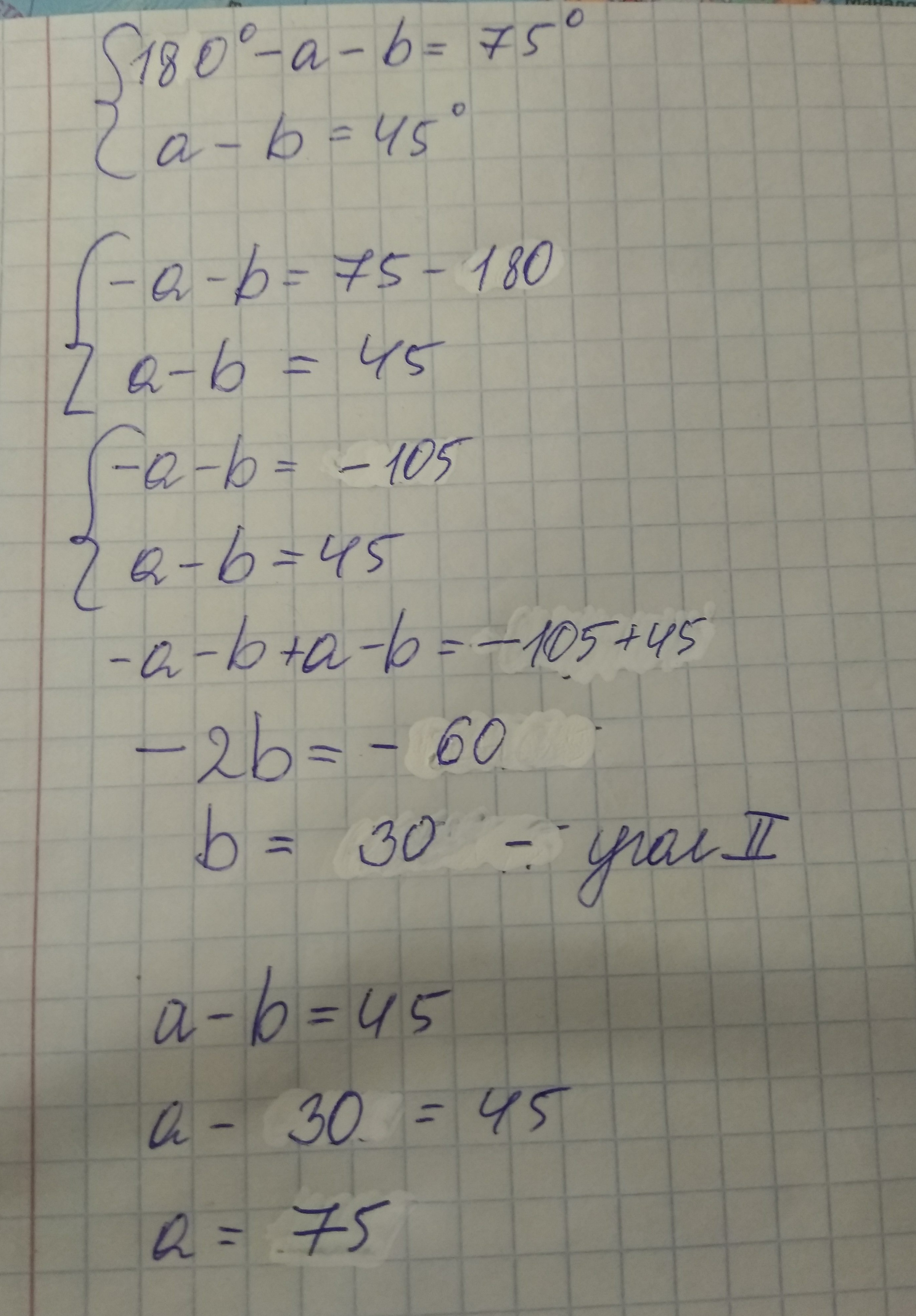 найди углы треугольника, зная, что один из его углов равен 75°, а разность двух других углов равна 45°