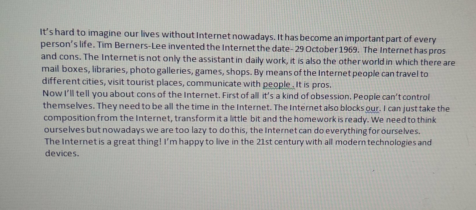 Итс хад ту имейджин ауа ливз визаут интернет науэдейз. Ит хэз бикам эн импотэнт пат эври пёсонз лайф. Тим Барнес ли инвайтед зэ интернет зэ дэйт твенти найн октобер найнтинсикстинайн. Зэ интернет хэз прос энд конс. Зэ интернет из нот онли зэ ассисэтент ин дэйли вок, ит из олсо зэ азер ворлд вич зе ра мэйл боксез, лайбрариз, фото галериз, геймз, шопс. Бай миэнз оф зэ интернет пипл кэн трэвл ту диферент ситиз, визит турист плэйсез, коммуникэйт виз пипл.Ит из прос.
