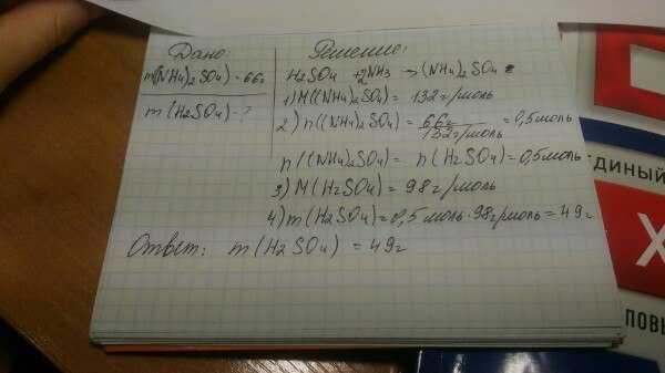 После пропускания через раствор серной кислоты аммиака (н.у) получили 66 г сульфата аммония. Вычислите массу серной кислоты.