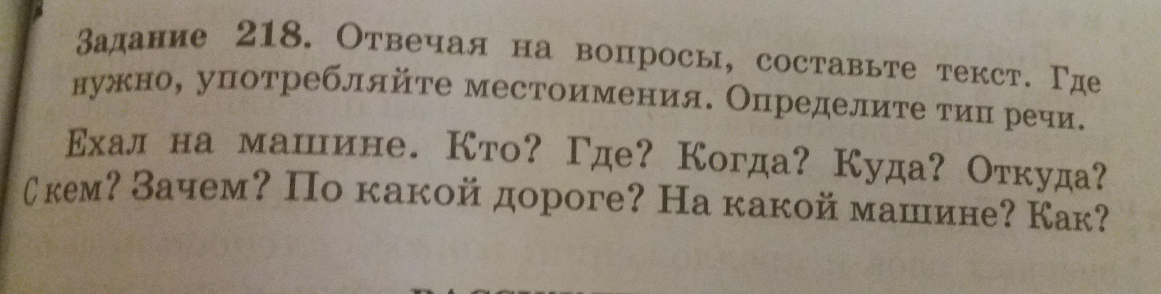 Однажды (когда?)в 6 часов вечера (кто?)мужчина ехал (где?)в машине (с кем?)со своей женой. (кто?)Мы ехали (откуда?)из Греции (куда?)в Россию (зачем?)для того, чтобы вернуться домой. Ехали (кто?)мы (на какой машине?)на ярко-красной машине (по какой дороге?)по кривой дороге. Это было очень (как?)неудобно.