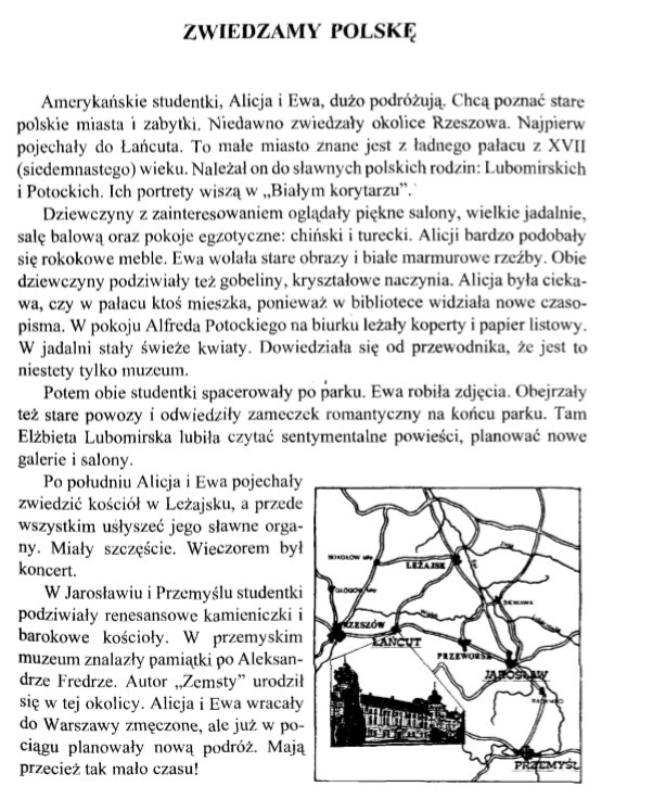 МЫ ВСТРЕЧАЕМ ПОЛЬШУ Американские студенты, Алича и Ева, много путешествуют Они хотят познакомиться с старыми польскими городами и памятниками. Недавно они посетили район Жешув. Сначала они отправились в Ланкут. Этот небольшой городок известен своим красивого дворец семнадцатого века (семнадцатый век Należalon в известных польских семьях:. Любомирский и Потоцкие Их портреты висят в Белом зале «Девушка с интересом наблюдала красивые холлы, большие столовые, банкетный зал, а также номер экзотический:.. Китайский iturecki Алисия очень любила мебель в стиле рококо, Ева предпочитала старые картины с белыми мраморными скульптурами, как гобелены, так и хрустальные сосуды. Алиса была в комнате, если бы были люди во дворце, потому что в комнате Альфреда Потоцки стол лежал конверты и писчую бумагу в столовой стал свежими цветами. она узнала из руководства, это, к сожалению, только музей. Затем два студента шел через парк. Ева сделала снимку. выглядела слишком старые вагоны и посещаемые замокли романтичные в конце парка. Там, Элизабет Любомирский Он любил читать сентиментальные романы, планировать новые галереи и лаунджи. Во второй половине дня Алича и Ева эхали посетить церковь в Лежайске, прежде всего, услышать ее знаменитые органы. Им повезло. Вечером был концерт. В Ярославском монастыре студенты восхищались домами ренессансного многоквартирного дома и барочными церквями. В музее Пшемысла были памятные вещи Александра Фредро. Автор «Мстительности» родился в этой области, Алиса и Ева возвращались в Варшаву усталыми, но они уже планировали новое путешествие в то время, у них так мало времени!