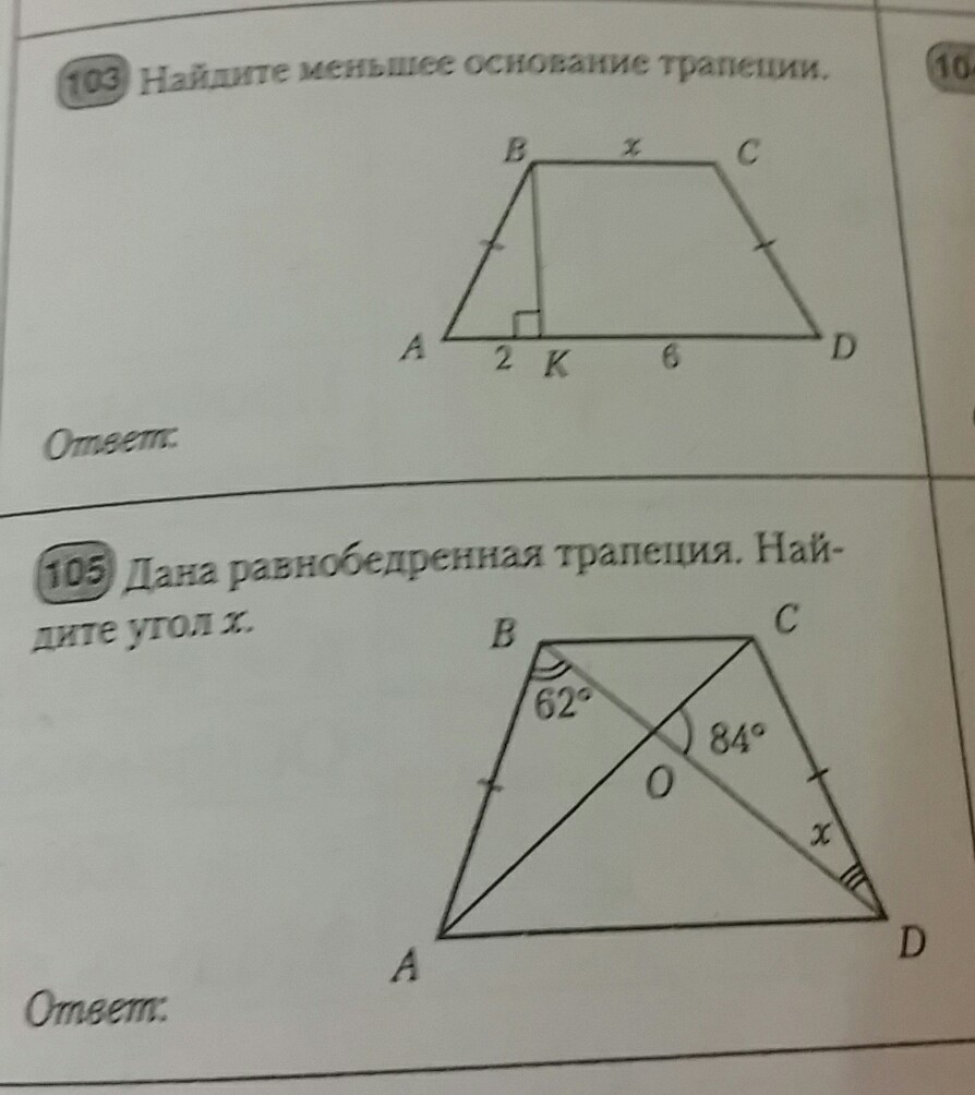 1)Посколько AB=CD, если провести из C перпендикуляр на AD ( Пусть в точку F) Получится, что FD=2см. Отсюда FK=BC=6-2=4 см.