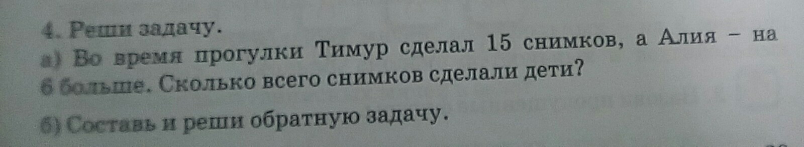 реши задачу ,во время прогулки Тимур сделал 15 снимков.,а Алия -на 6 больше.сколько всего снимков сделали дети?