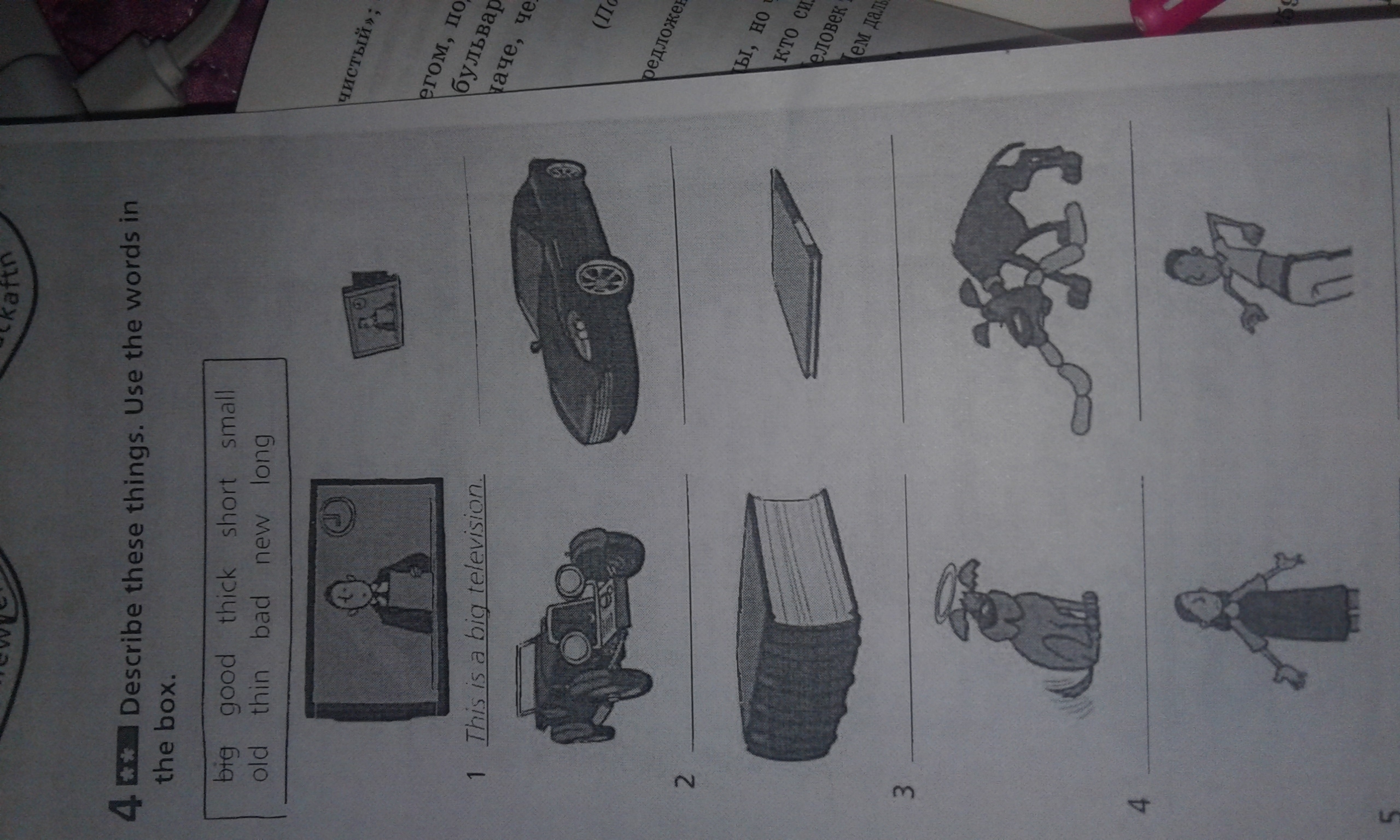 1) This is a small photo frame 2) This is an old car. This is a new car. 3) This is a thick book. This is a thin book. 4) This is a good dog. This is a bad dog. 5) что то с long и short, но я не пойму в чем там сравнение)