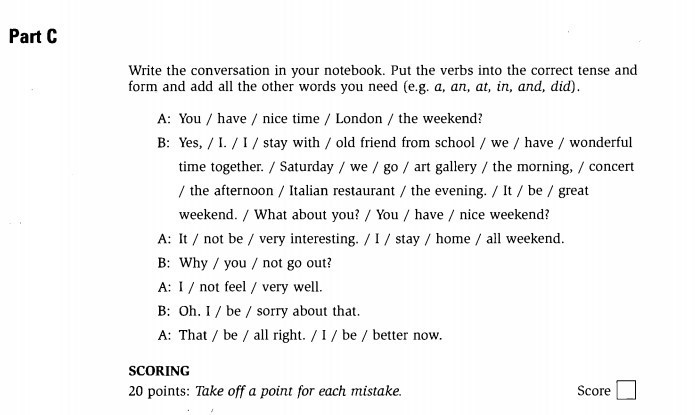 B: Yes, I did. I stayed with an old friend from school and we had a wonderful time together. Saturday we went to an art gallery in the morning, a concert in the afternoon, an Italian restaurant in the evening. It was a great weekend. What about you? Did you have a nice weekend?