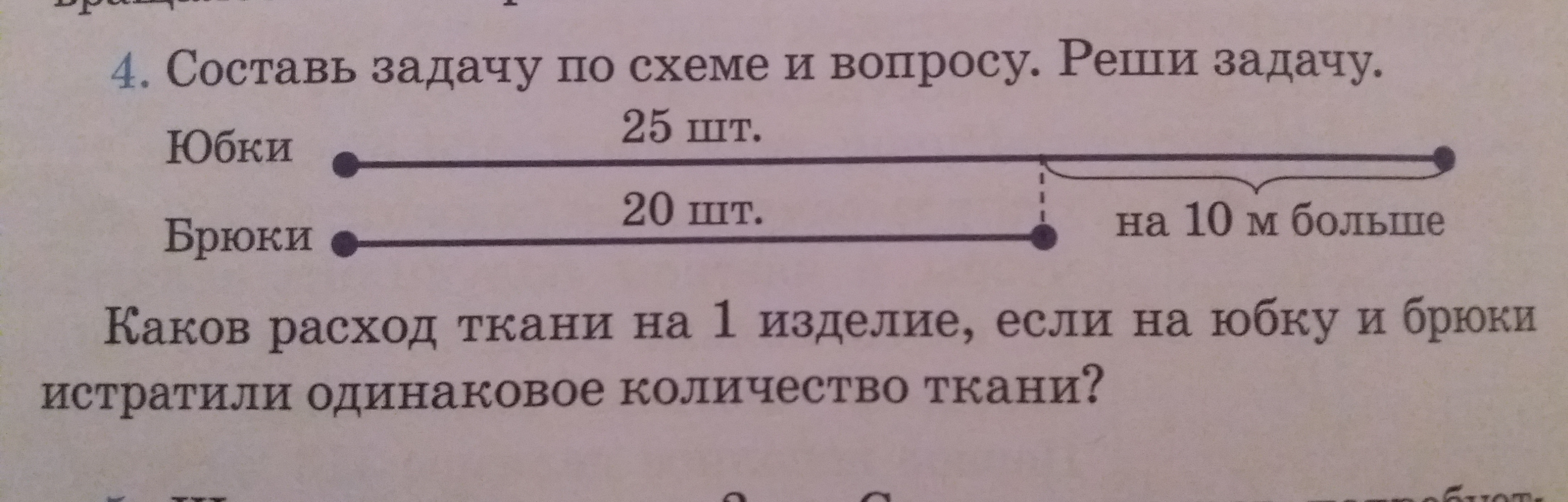 На фабрике изготовили 25 шт. Юбок и 20 ш. брюк. На юбки потратили на 10м ткани больше, чем на брюки. Сколько ткани нужно на одно изделие?.