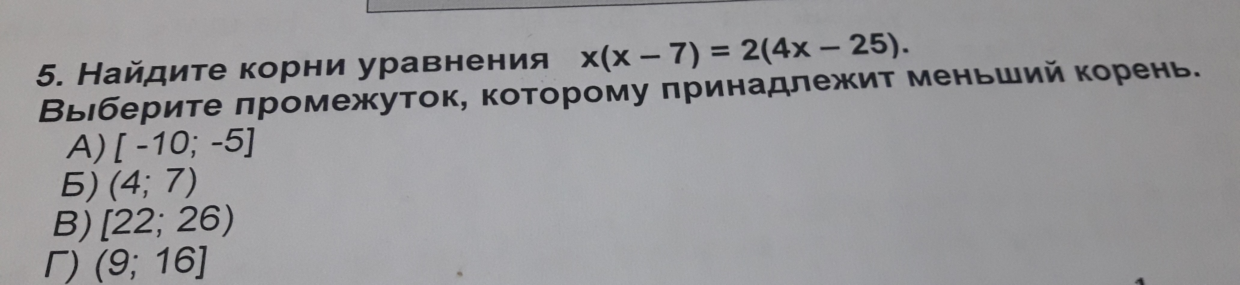 В вопросе сказано КАКОМУ ПРОМЕЖУТКУ принадлежит меньший корень. Меньший корень равен пяти. Пять лежит на промежутке между 4 и 7)