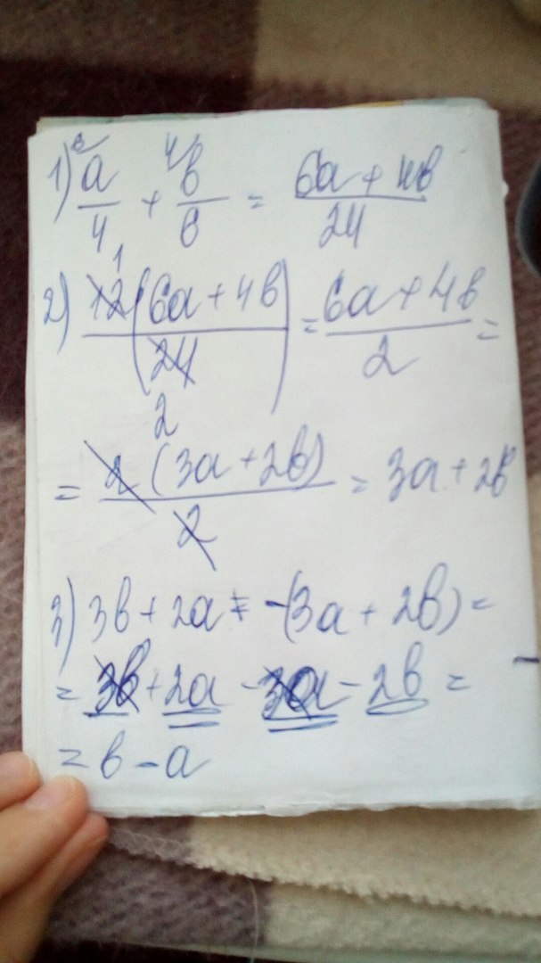 3b+2a-12*(a/4+b/6)=3b-2a-12((3a+2b)/12)=3b-2a-12((3a/12) + (2b/12))=3b-2a-((12/1*3a/12)+(12/1*2b/12))=3b-2a-3a-2b=b-5a