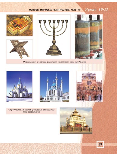 Семисвечник - к иудаизму, перекрещенный столик - к исламу. Предмет в виде колокола к буддизму.