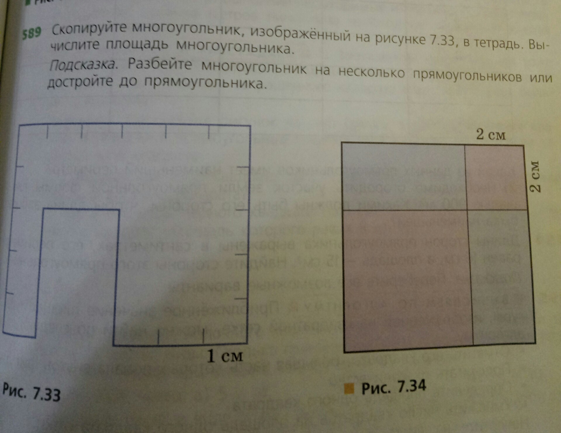 Задание:Скопируйте многоугольник,изображенный на рисунке в тетрадь.Вычислите площадь многоугольника.Подсказка разбейте многоугольник на несколько прямоугольников или достройте до прямоугольника.