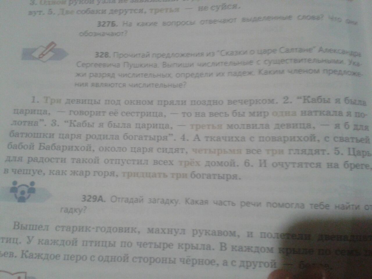 1.Три(колич.,И.п.,подлежащее) девицы.2.Одна(колич.,И.п.,подлежащее) я.3.Третья(поряд.,И.п.,подлежащее) девица.4.Четырьмя(колич.,Т.п.,дополнение) все три(колич.,И.п.,подлежащее).5.Всех трёх(колич.,Р.п.,дополнение).6.Тридцать три(колич.,И.п.,подлежащее) богатыря.