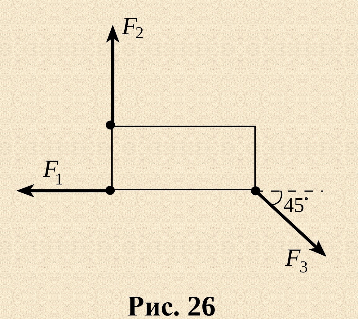СРОЧНООООО!!!!!ПОМОГИТЕ ПОЖАЛУЙСТА, КТО ПОНИМАЕТ!!!! На прямоугольную пластину (рис.26) в её плоскости действуют силы F1=F2=7H, F3=7√2H. Покажите, что у такой системы сил нет равнодействующей. Опишите качественно начальный характер движения пластины под действием этих сил из неподвижного состояния.