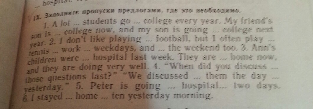 1. of, to, at, to. 2. -, -, at, on, at. 3. in, at. 4. -, -, before. 5. to, for. 6. at, at.