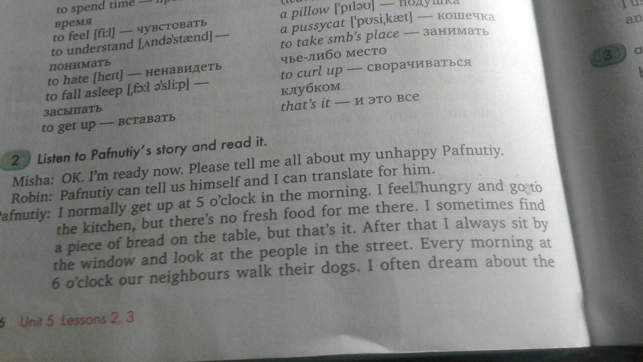 -Обычно я просыпаюсь в пять утра. Я хочу есть и иду на кухню, но тут нет свежей еды. Иногда я нахожу кусок хлеба на столе, но это все, что есть. После этого я всегда сижу около окна и наблюдаю за людьми на улице. Каждое утро в 6 утра наши соседи выгуливают собак. Я часто мечтаю о...