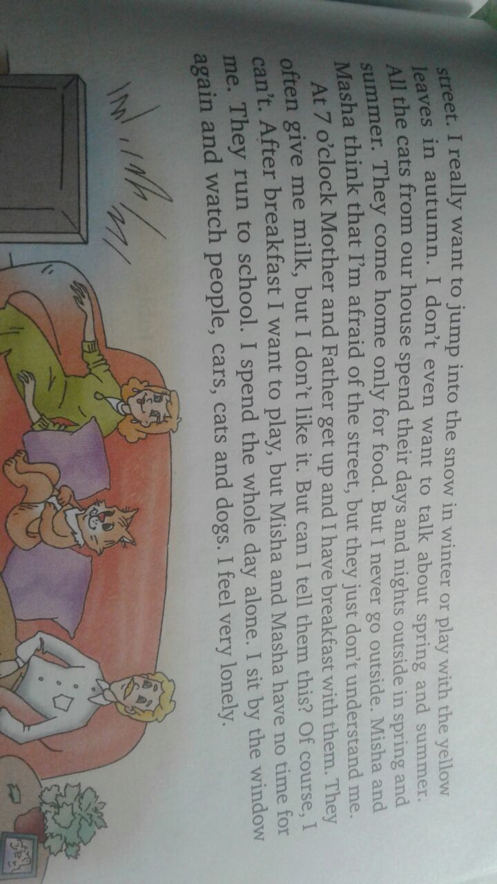 в отставке. Я очень хочу прыгать в снег зимой или играть с желтымилистьями осенью. Я даже не хочу говорить о весне и лете.Все кошки из нашего дома проводят свои дни и ночи на улице весной илетом. Они возвращаются домой только за едой. Но я никогда не выхожу наружу. Миша иМаша думают, что я боюсь улицы, но они просто меня не понимают.В 7 часов мать и отец встают и я иду завтракать с ними. Они дают мне молоко, но мне это оно нравится. Но может им сказать это? Конечно, не могу. После завтрака! Я хочу играть, но у Миши и Маши нет времени на меня. Они бегут в школу. Я провела целый день одна. Я сижу у окна снова наблюдаю за людьми, машинами, кошками и собаками. Мне очень одиноко.