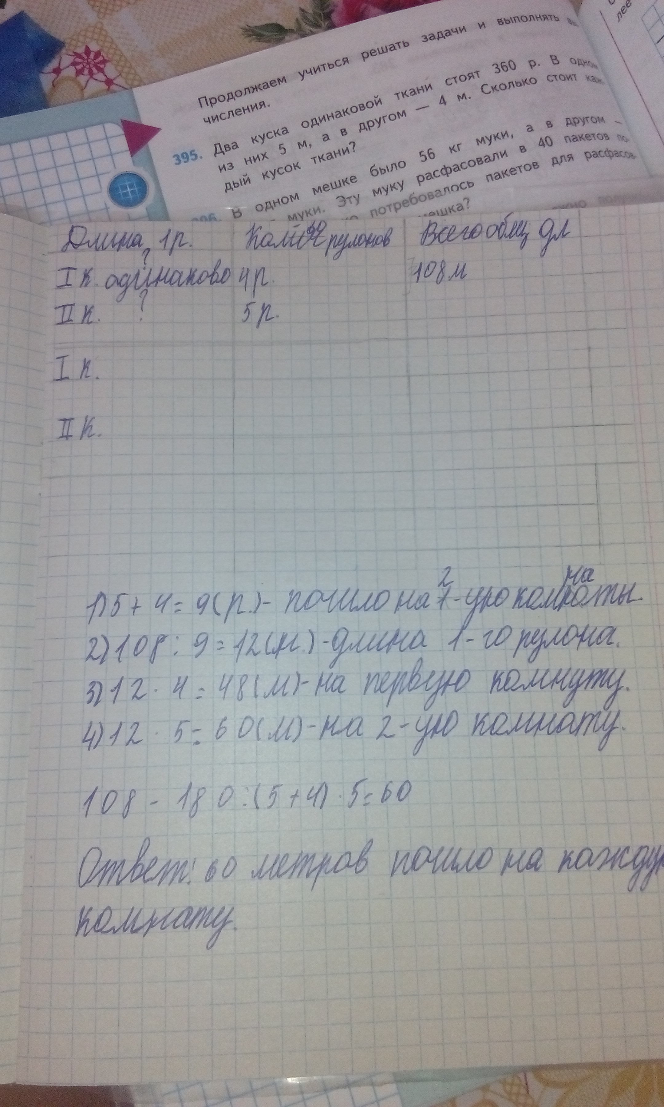 на оклейку двух комнат пошло 9 рулонов обоев одинаковой длины.На одну комнату пошло 48 м обоев,на другую 60 м.Сколько рулонов обоев пошло на каждую