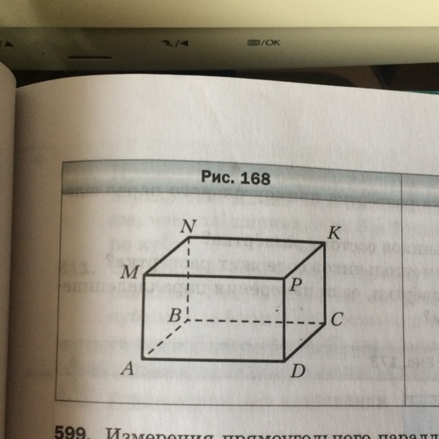На рисунке 168(рисунок внизу) изображён прямоугольный параллелепипед ABCDMNKP. Назовите: 1.грани, которым принадлежит точка С; 2. Рёбра, равные ребру BC; 3. Верхнюю грань; 4. Вершины, принадлежащие нижней грани; 5. Грани, имеющие общее ребро АМ; 6. Грань, равную грани DPKC.