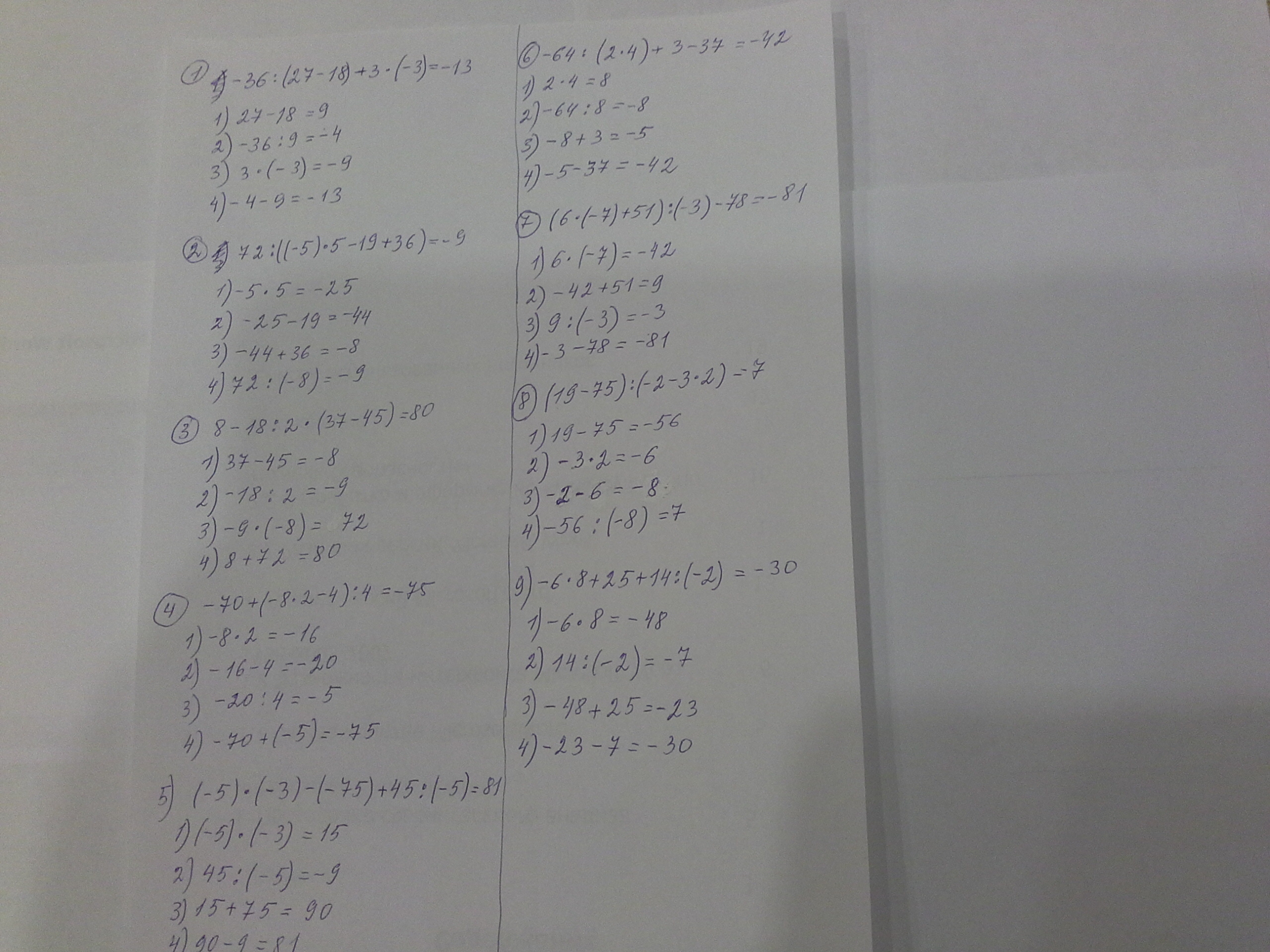 Помогите пожалуйста с примерами. С подробным решением. 1) -36:(27-18)+3*(-3). 2) 72:((-5)*5-19+36) 3) 8-18:2*(37-45). 4) -70+(-8*2-4):4. 5) (-5)*(-3)-(-75)+45:(-5). 6) -64:(2*4)+3-37. 7) (6*(-7)+51):(-3)-78. 8) (19-75):(-2-3*2). 9) -6*8+25+14:(-2).