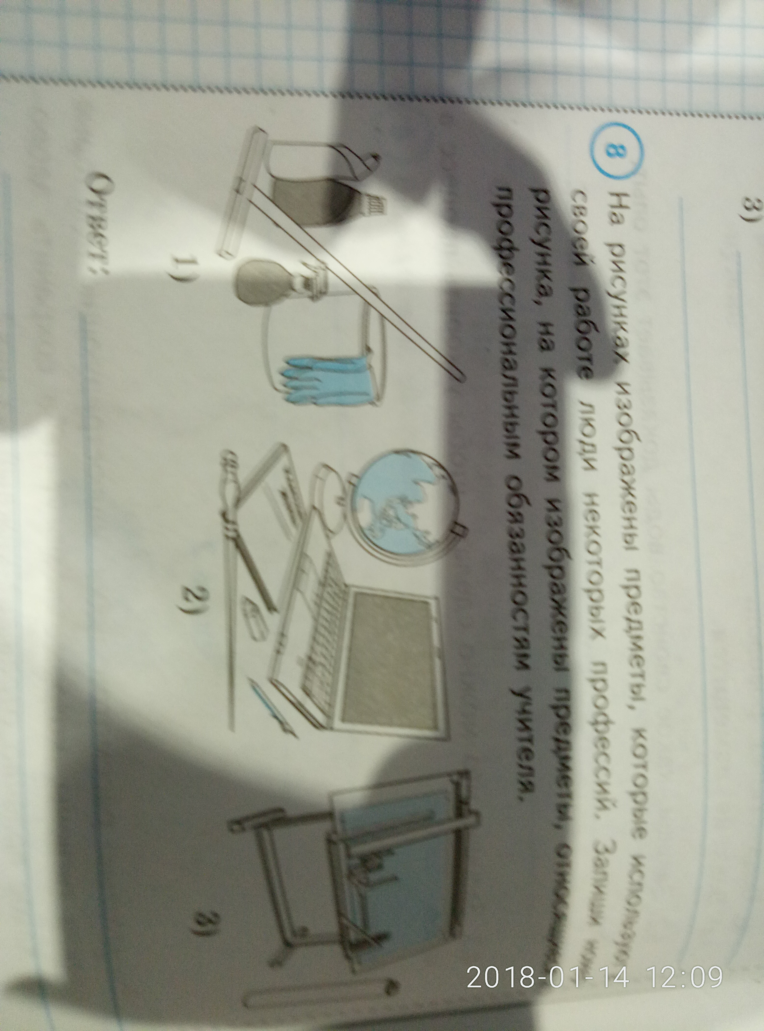 На рисунках изображены предметы которые используются в своей работе люди некоторых профессий. Запиши номер рисунка, на котором изображены предметы, относящиеся к професиональным обязаностям учителя