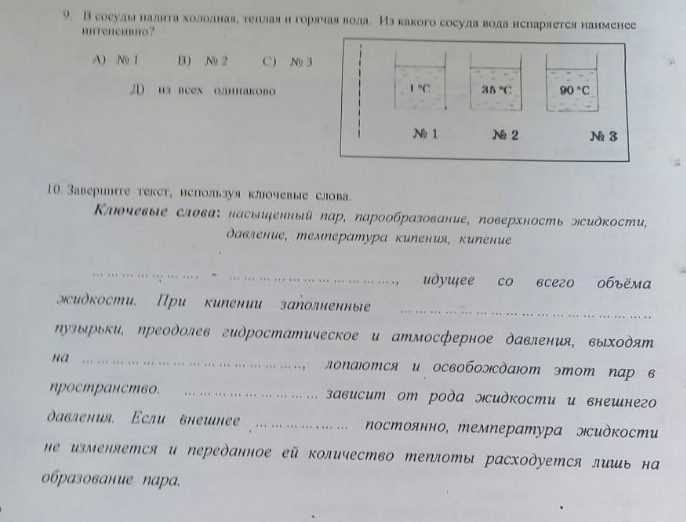 10 - Кипение - это парообразование, идущее со всего обьема жидкости. При кипении наполненные насыщенным паром пузырьки , преодолев гидростатическое и атмосферное давления, выходят на поверхность жидкости, лопаются и освобождают этот пар в пространство, температура кипения зависит от рода жидкости и внешнего давления. Если внешнее давление постоянно, температура жикости не изменяется и переданное ей количество теплоты расходуется лишь на образование пара